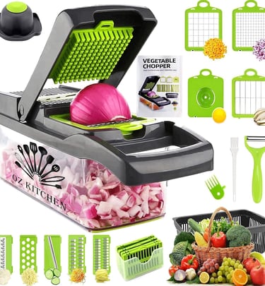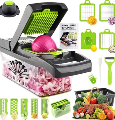 Simplify meal prep with the Oz Kitchen Vegetable Chopper. Featuring 17 interchangeable blades, it slices, dices, and chops in seconds. Made from durable stainless steel and BPA-free plastic, it includes a drain basket, egg slicer, and cleaning tools — fast, tidy, and efficient.