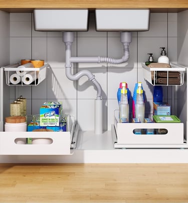 Maximize your space with this 2-tier under-sink organizer. Featuring smooth slide-out drawers and a sturdy metal frame, it’s perfect for neatly storing cleaning supplies, toiletries, or kitchen essentials — durable, sleek, and easy to assemble.