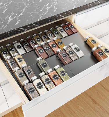 Stay organized in style. This 4-tier expandable spice rack adjusts to fit most drawers, holding up to 58 jars. Made from rust-free aluminum with a non-slip design — perfect for spices, cosmetics, or vitamins. Sleek, sturdy, and space-saving.