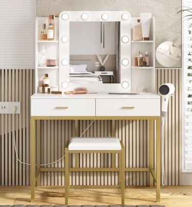 A vanity that blends beauty and function. With built-in lights, charging ports, and sleek gold details, this modern dressing table is perfect for organizing your beauty essentials while adding a touch of glam to your space.