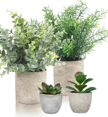 Add a touch of nature to any space — no watering required. This 4-pack of mini artificial plants brings effortless greenery to desks, shelves, and countertops, creating a fresh and calming vibe all year round.